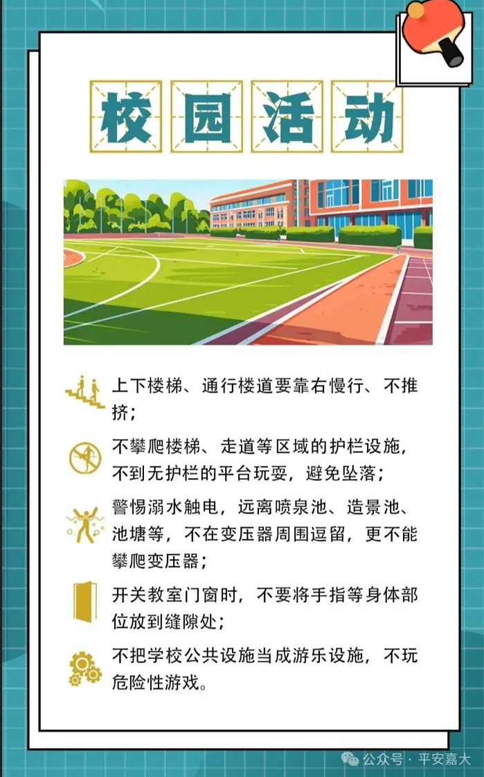 ● 保障活动安全:在体育、实习和外出活动中,遵守规程,做好防护,预防意外伤害
